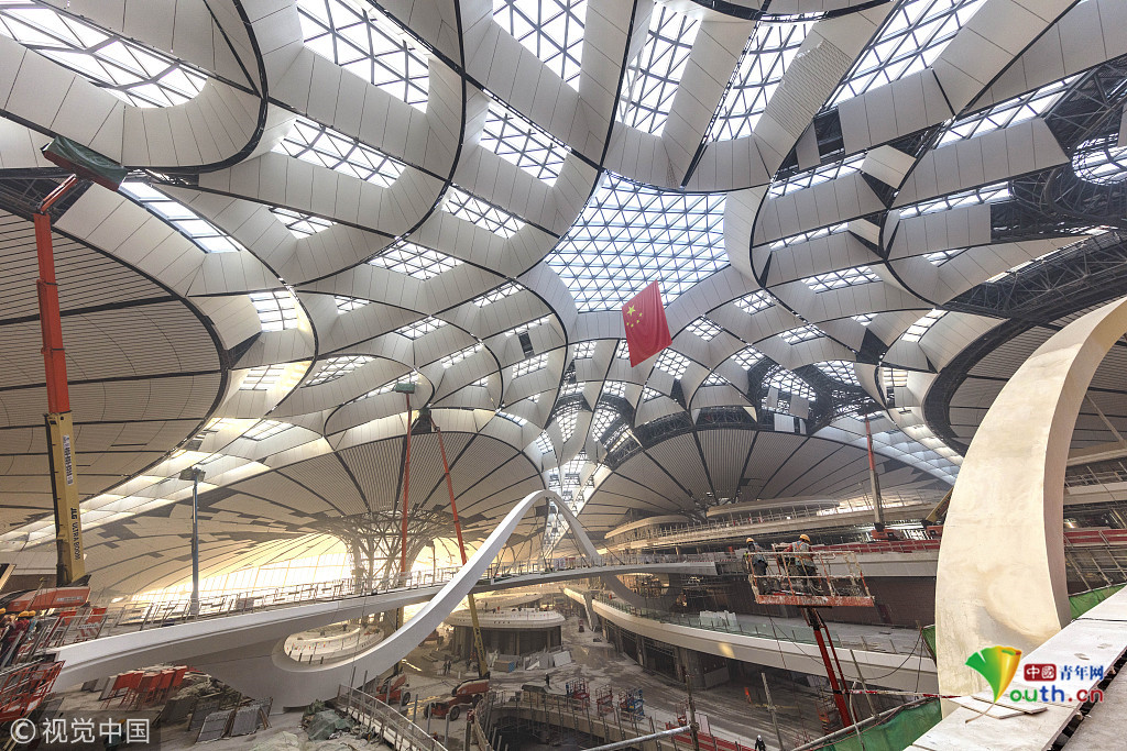 中國(guó)青年網(wǎng)北京12月20日電 2018年12月19日,北京大興國(guó)際機(jī)場(chǎng)航站樓的屋面已基本完工,一只金色“鳳凰”完整地出現(xiàn)在北京城南。航站樓的室內(nèi)裝修在有條不紊的推進(jìn)中。