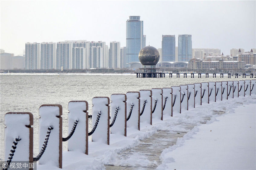 2018年12月7日,山東煙臺,雪后的海濱景色。