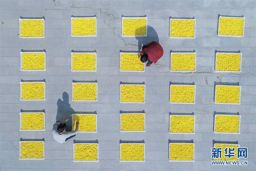 2018年11月7日,河北省魏縣魏城鎮(zhèn)町上村農(nóng)民在分揀晾曬菊花。 大地之色,俯仰之間;壯美山河,是我的祖國。2018年,新華社記者操縱無人機(jī)“飛閱”華夏大地,在最美的時(shí)節(jié),定格下她的色彩斑斕。 新華社記者 朱旭東 攝