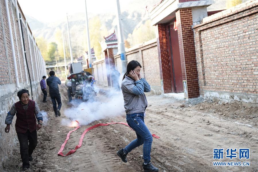 在青海省民和回族土族自治縣松樹鄉(xiāng)牙合移民新村,貧困戶胡秀英家在新家的門口放鞭炮慶祝(11月2日攝)。