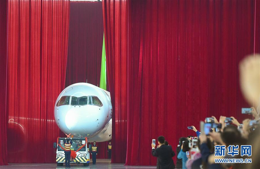 我國自主研制的C919大型客機(jī)首架機(jī),在中國商飛公司總裝制造中心浦東基地廠房內(nèi)正式下線(2015年11月2日攝)。新華社發(fā)(裴鑫攝)