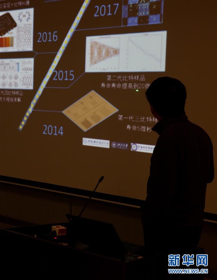 2017年5月3日,中國科學(xué)技術(shù)大學(xué)潘建偉院士在上海宣布,我國科研團(tuán)隊(duì)成功構(gòu)建的光量子計算機(jī),首次演示了超越早期經(jīng)典計算機(jī)的量子計算能力。這是潘建偉院士在介紹“超導(dǎo)量子計算機(jī)路線圖”。 新華社記者 金立旺攝