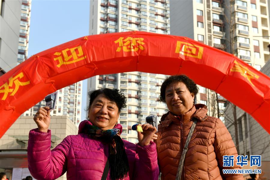 12月20日,在濟(jì)南市槐蔭區(qū)和諧佳苑小區(qū),回遷居民邵虹(左)和賈桂芝展示領(lǐng)到的回遷房鑰匙。 當(dāng)日,濟(jì)南市槐蔭區(qū)經(jīng)十一路棚戶區(qū)改造項(xiàng)目——和諧佳苑小區(qū)正式交付居民回遷安居。作為濟(jì)南市槐蔭區(qū)頭號民生工程,本項(xiàng)目共17棟安置樓,實(shí)現(xiàn)棚戶區(qū)居民“出棚進(jìn)樓”,改善安居環(huán)境。 新華社記者 郭緒雷 攝