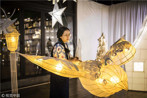 2018年5月6日,廣州,在天河區(qū)一家大商場辦個(gè)展時(shí),用紙片做成的北極熊、大松樹、火烈鳥、紙房子在光線的配合下美輪美奐,吸引了很多顧客駐足?!皫缀趺總€(gè)人一看到,都會(huì)走進(jìn)那個(gè)夢幻的場景里,和這些紙雕一起合影。”圖片攝于2018年5月6日。南塘/視覺中國