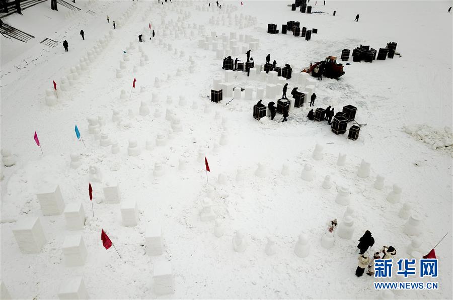 在松花江哈爾濱段江面上,制作中的部分雪人(12月21日無人機拍攝)。
