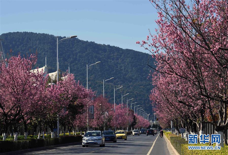 這是昆明市西山區(qū)紅塔西路櫻花大道(12月21日攝)。