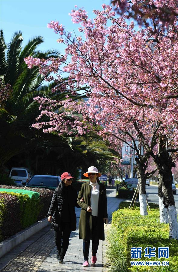 12月21日,游客行走在昆明市西山區(qū)櫻花盛開的人行道上。新華社記者楊宗友攝