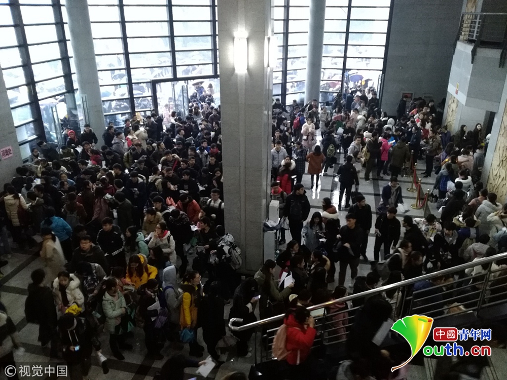 2018年12月22日,南京,在南京林業(yè)大學(xué)考點(diǎn),考生在雨中復(fù)習(xí),看考場(chǎng)分布圖,候考和進(jìn)場(chǎng)。