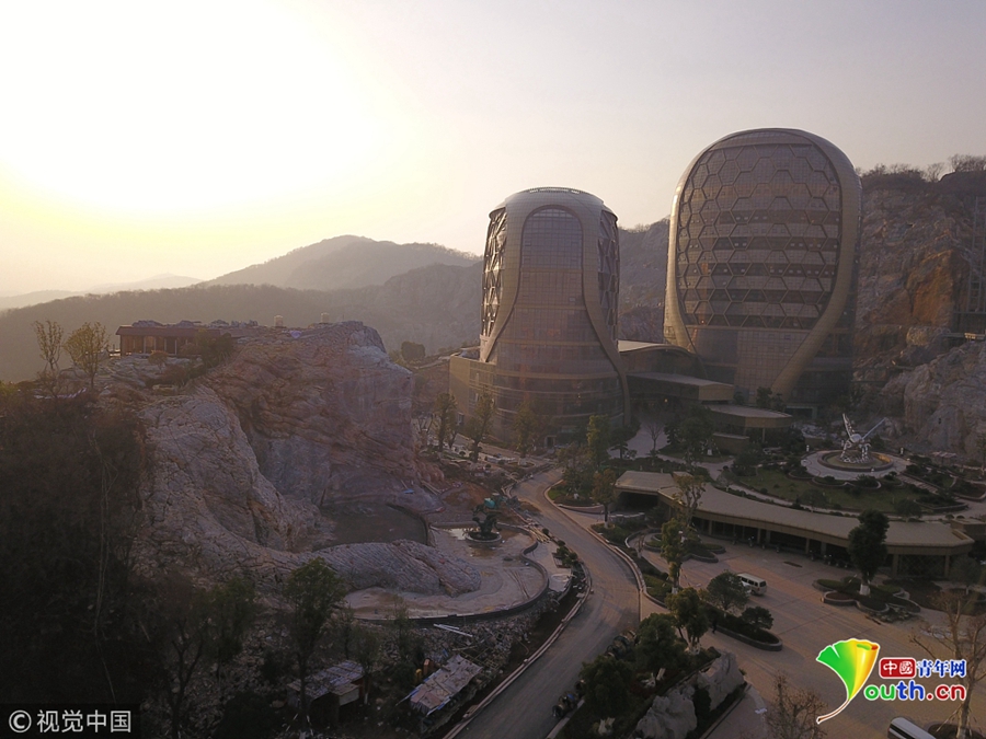 2018年12月23日,南京浦口區(qū)老山風景區(qū)三河采石場宕口,利用宕口廢棄工地進行生態(tài)修復的蜂巢酒店主體完工。經(jīng)過100名雕刻工人近半年的施工,酒店兩側(cè)被破壞的山體變成兩只高30多米的巨型山體雕塑石獅,栩栩如生,場面極其震撼。
