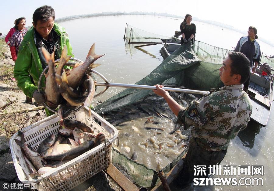 江蘇揚(yáng)州,漁夫?qū)Ⅳ~(yú)撈出過(guò)秤。