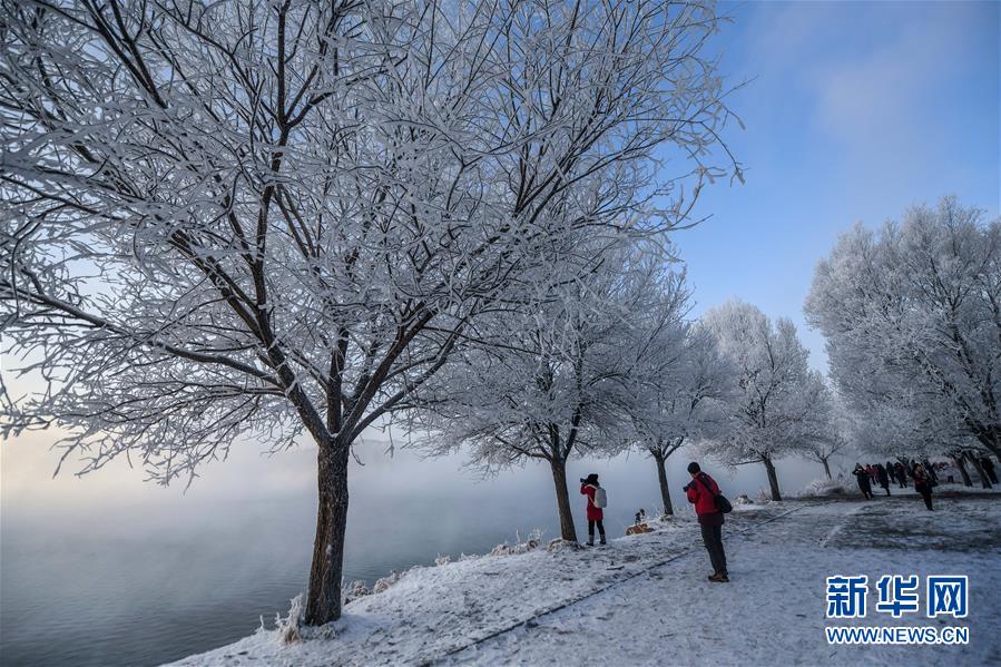 12月12日,游人在吉林省吉林市豐滿區(qū)吉豐東路松花江畔觀賞霧凇美景。 新華社記者張楠攝