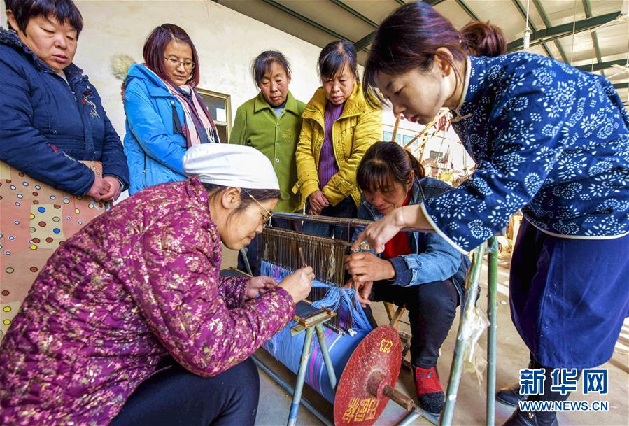 12月25日,在衡水市冀州區(qū)一家老粗布生產企業(yè),田園棉手織粗布傳承人(右一)在指導村民學習田園棉手織粗布技藝。 2018年以來,河北省衡水市冀州區(qū)依托當?shù)氐氖〖壏沁z田園棉手織粗布技藝資源,采取“非遺+扶貧”的模式,通過非遺傳承人開展技能培訓、老師傅傳幫帶等,讓貧困村民在傳承非遺文化的同時學習傳統(tǒng)技藝,助力脫貧致富。 新華社記者 李曉果 攝