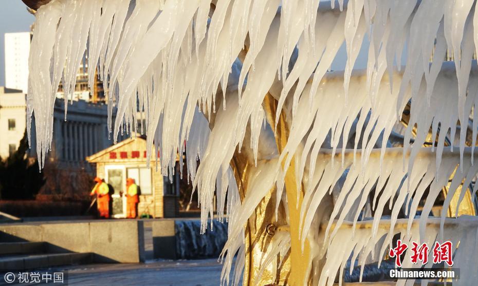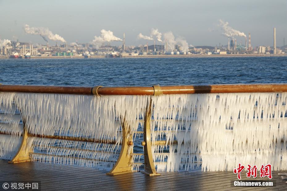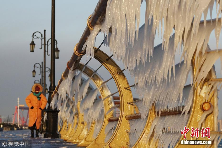 渤海海水在北風(fēng)的作用下涌向岸邊,在大連東港海岸護(hù)欄上凝結(jié)成冰凌,形成約有兩公里的冰凌奇觀。圖為大連市東港海岸護(hù)欄結(jié)滿(mǎn)晶瑩剔透的冰棱。圖片來(lái)源:視覺(jué)中國(guó)