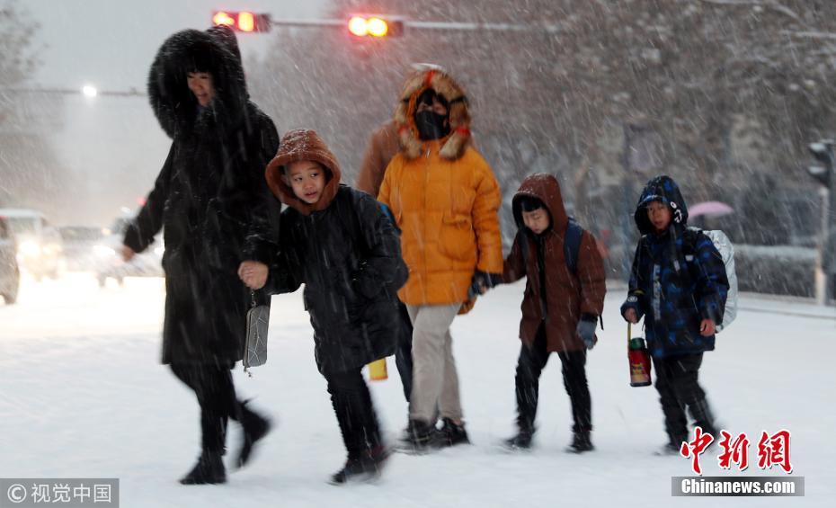河北石家莊井陘縣縣城,人們?cè)谘┲谐鲂?。受多股冷空氣的持續(xù)影響石家莊出現(xiàn)降雪、降溫天氣。圖片來(lái)源:視覺(jué)中國(guó)