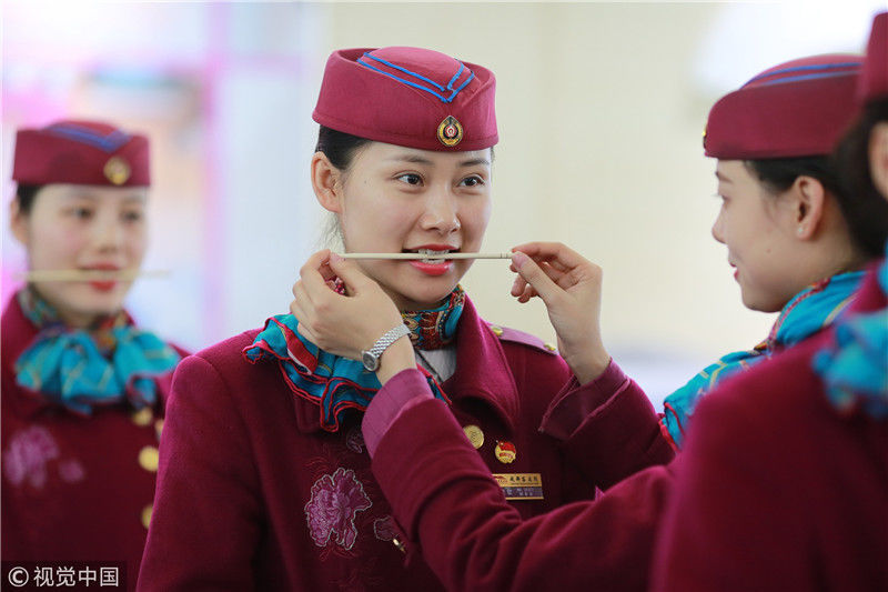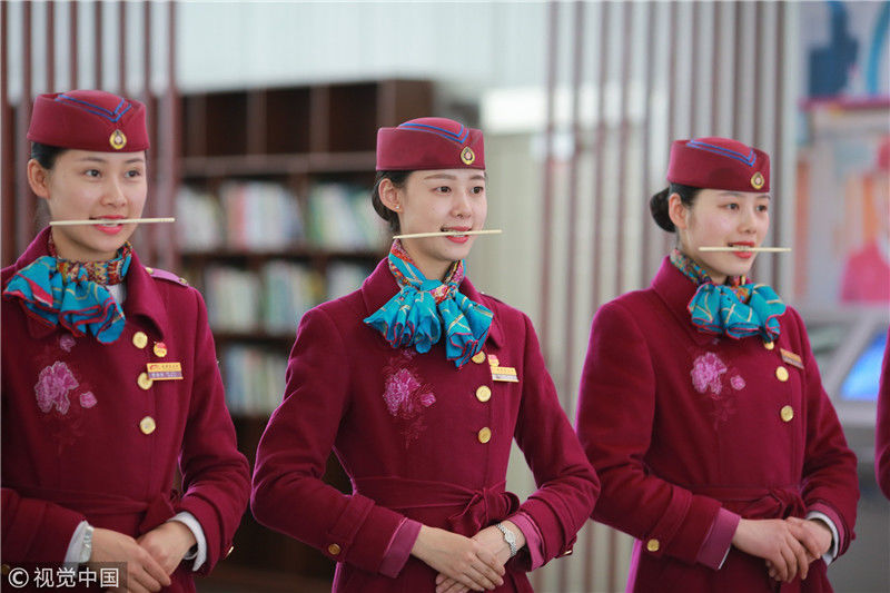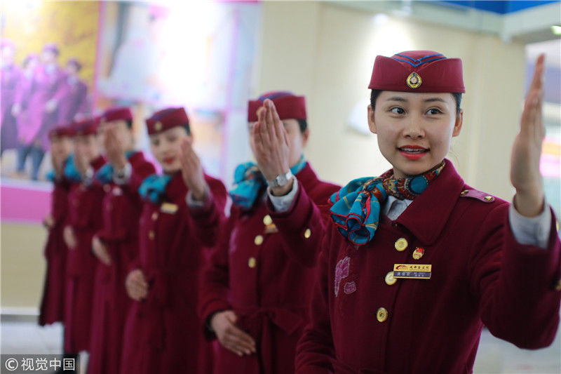2018年12月27日,四川成都,為備戰(zhàn)即將開通的成雅鐵路,中國鐵路成都局集團有限公司成都客運段動車二隊對成雅動車的乘務(wù)人員進行理論、形體、服務(wù)禮儀等內(nèi)容的培訓(xùn)。蘇志剛/視覺中國