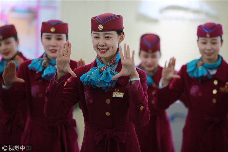 2018年12月27日,四川成都,為備戰(zhàn)即將開通的成雅鐵路,中國鐵路成都局集團有限公司成都客運段動車二隊對成雅動車的乘務人員進行理論、形體、服務禮儀等內(nèi)容的培訓。