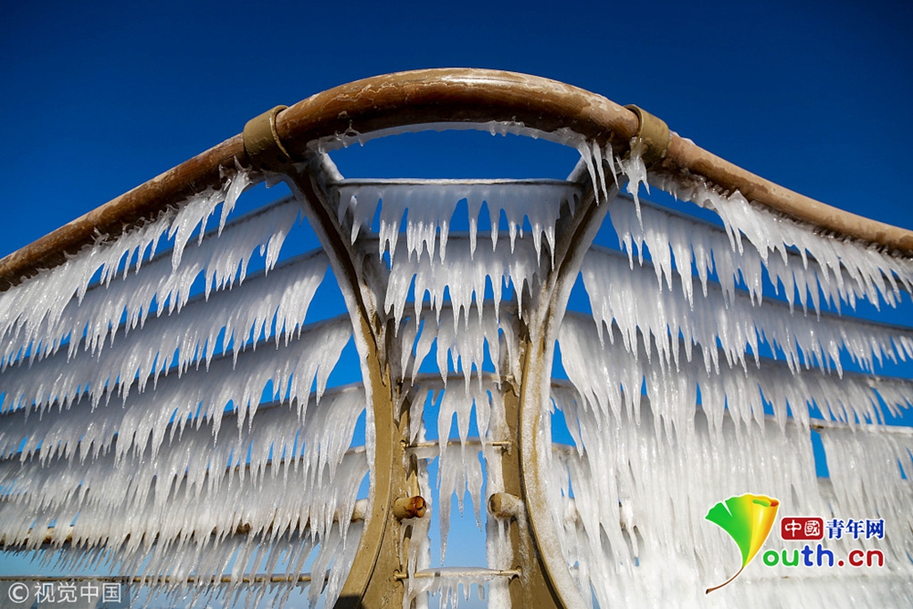 2018年12月29日,大連市迎來(lái)入冬以來(lái)最冷-12℃的低溫,在大風(fēng)和潮汐的作用下,海水在岸邊的護(hù)欄上瞬間凝固,凝結(jié)并形成大面積形狀各異的冰凌,在延綿5公里的木棧道上形成奇特的冰凌奇觀。