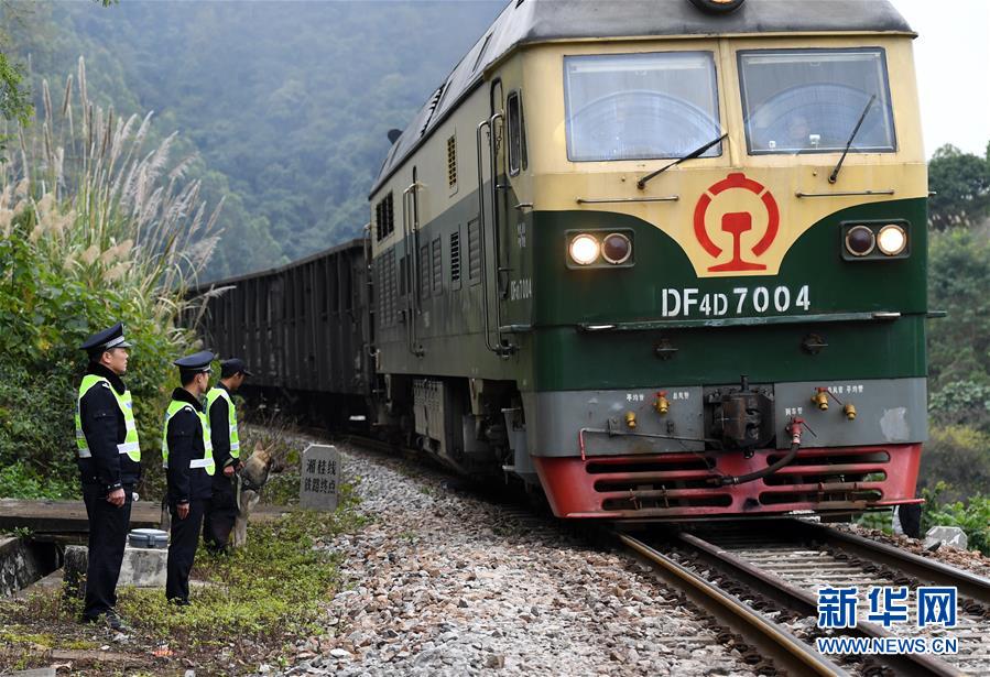 鐵路公安民警陸日峰(左一)和同事目送著一列火車通過湘桂線鐵路終點(diǎn)從越南進(jìn)入中國(guó)(2018年12月31日攝)。新華社記者陸波岸攝