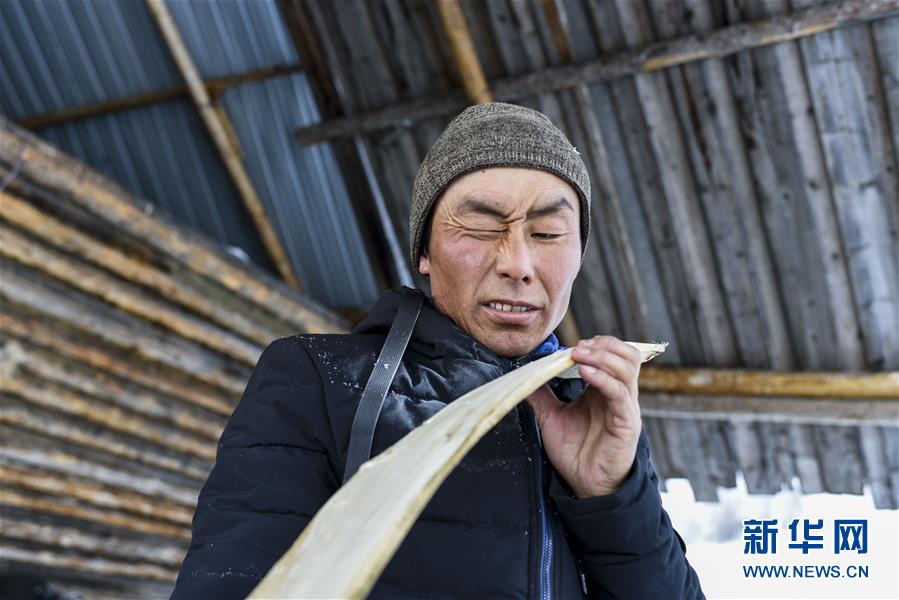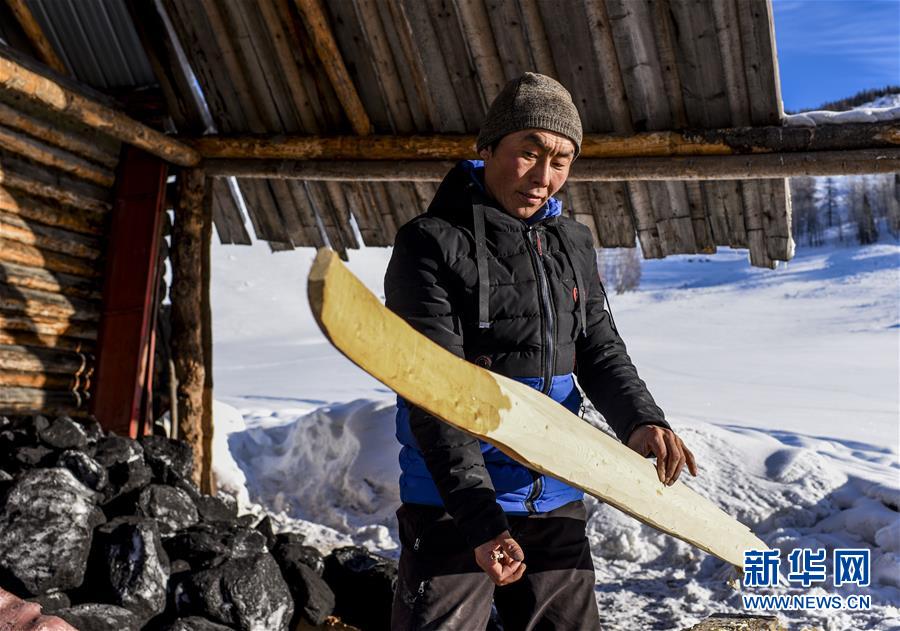 在新疆布爾津縣禾木村的一處冬季牧場,森格爾在制作毛皮滑雪板時檢查滑雪板的平面(1月3日攝)。新華社記者 胡虎虎 攝