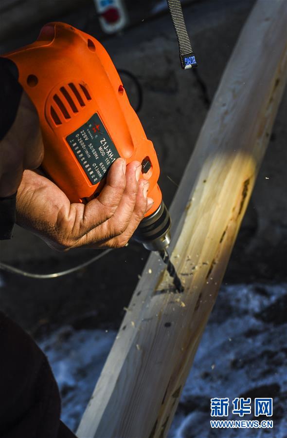 在新疆布爾津縣禾木村的一處冬季牧場,森格爾在制作毛皮滑雪板時在木材上鉆孔(1月3日攝)。新華社記者 胡虎虎 攝
