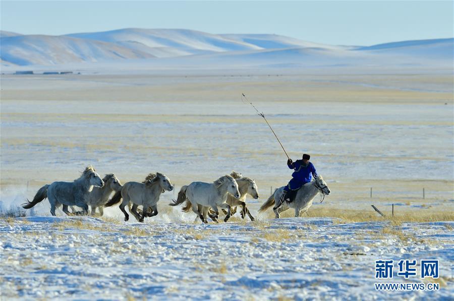 1月8日,牧民進行套馬表演。 時下正值草原冬季旅游旺季,內(nèi)蒙古自治區(qū)西烏珠穆沁旗的牧民們在雪原上一展身手,為游客展現(xiàn)獨特的民族風情。 新華社記者 鄒予 攝
