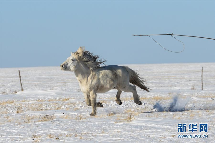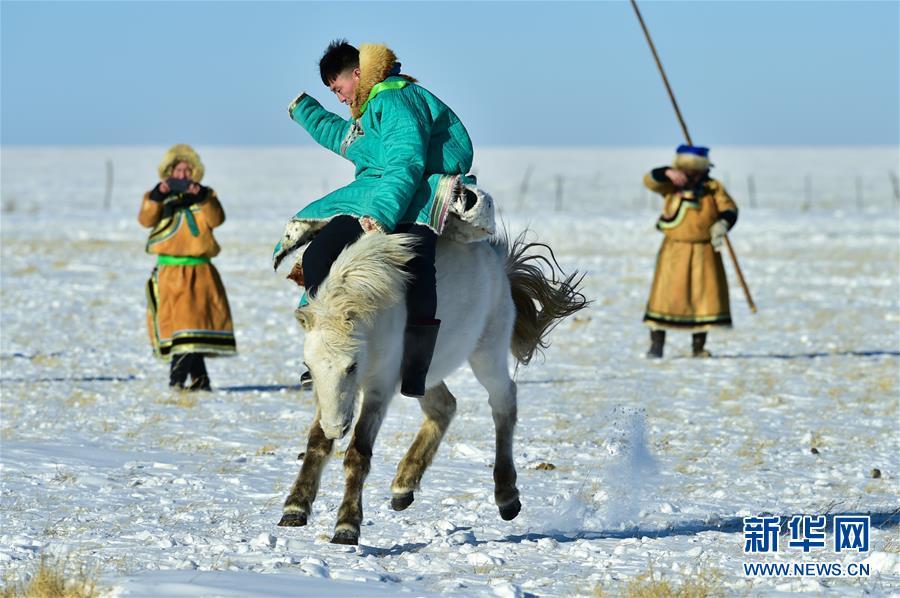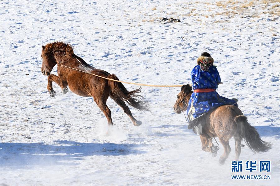 1月8日,牧民在馴服一匹烈馬。 時(shí)下正值草原冬季旅游旺季,內(nèi)蒙古自治區(qū)西烏珠穆沁旗的牧民們?cè)谘┰弦徽股硎?,為游客展現(xiàn)獨(dú)特的民族風(fēng)情。 新華社記者 鄒予 攝