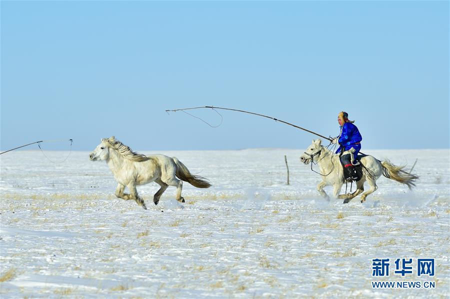 1月8日,牧民進(jìn)行套馬表演。 時(shí)下正值草原冬季旅游旺季,內(nèi)蒙古自治區(qū)西烏珠穆沁旗的牧民們?cè)谘┰弦徽股硎?,為游客展現(xiàn)獨(dú)特的民族風(fēng)情。 新華社記者 鄒予 攝