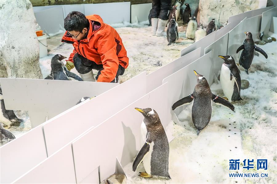 1月9日,馴養(yǎng)員給白眉企鵝寶寶喂食。 新華社記者 潘昱龍 攝