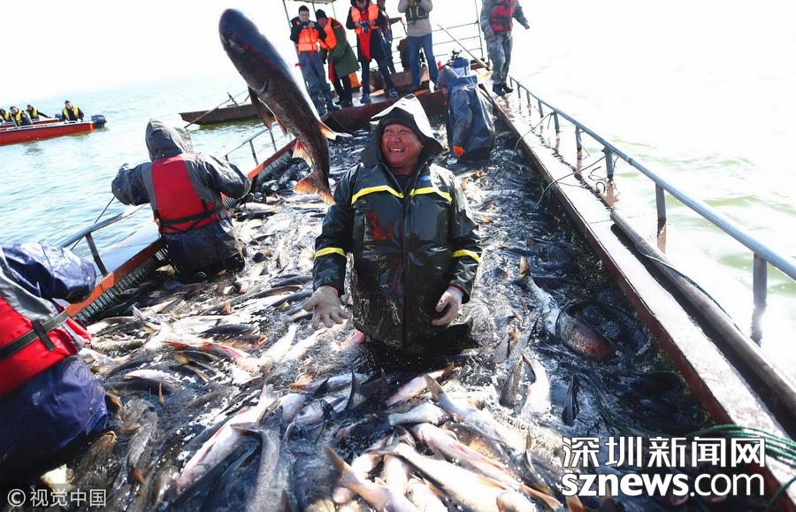 在河南省洛陽市嵩縣,第三屆陸渾開漁節(jié)啟幕,捕撈隊(duì)員們在湖心零下十幾度的溫度下開始捕魚,收獲新年“第一網(wǎng)”——超10噸魚,現(xiàn)場一派魚躍人歡的喜悅景象。