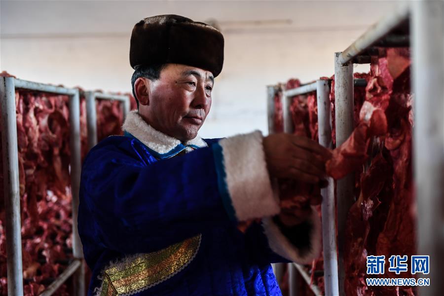 1月9日,牧民伊拉代在查看風(fēng)干牛肉。 新華社記者 劉磊 攝