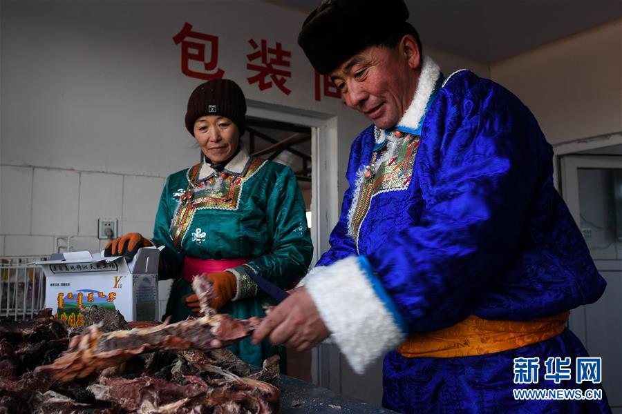 1月9日,牧民伊拉代(右)和妻子斯琴高娃在分割已經(jīng)風干好的牛肉。新華社記者 劉磊 攝