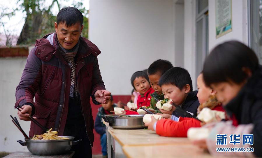1月3日,燒完飯菜后,章站亮(左)給學(xué)校的學(xué)生們盛菜。 新華社記者 胡晨歡 攝