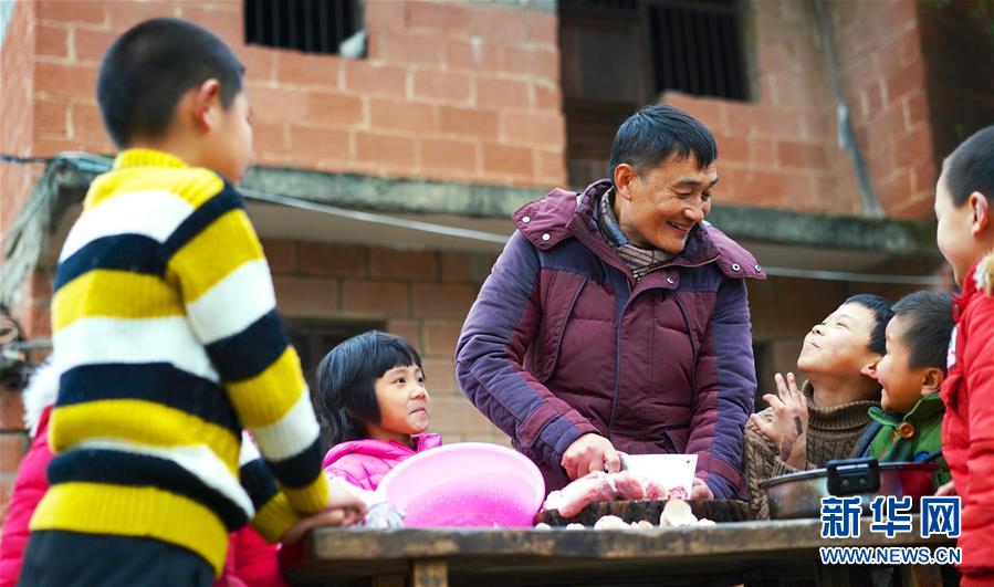 1月3日,章站亮(左三)在學(xué)校的操場上切肉。由于學(xué)校沒有室內(nèi)的廚房和食堂,章站亮只能在露天的環(huán)境下為學(xué)生們準(zhǔn)備餐點(diǎn)。  新華社記者 胡晨歡 攝