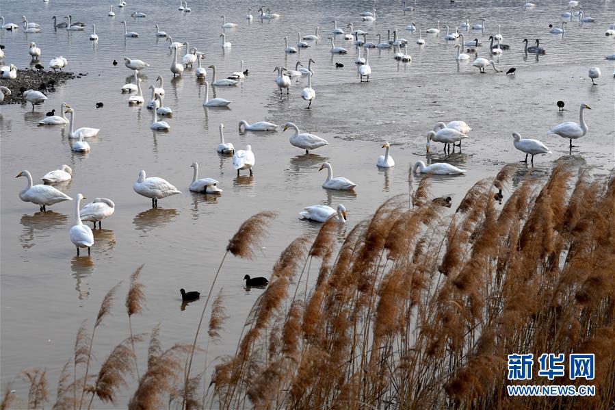1月3日,白天鵝在三門峽黃河濕地棲息。  新華社記者王丁攝