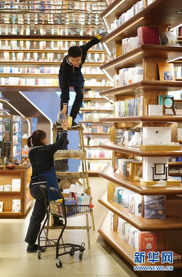 1月14日,西安高新區(qū)一家大型書(shū)店的工作人員在店內(nèi)整理書(shū)籍。