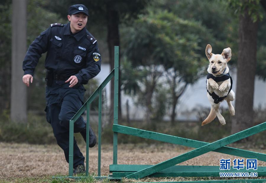1月15日,警犬“皮特”在訓導員丁巖的帶領下進行崗前特訓。新華社記者 程敏 攝