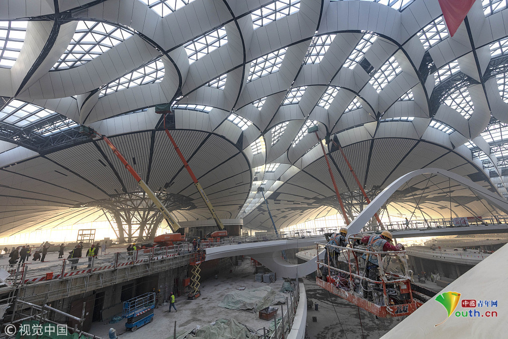 2018年12月19日,北京大興國際機場航站樓的室內(nèi)裝修在有條不紊的推進(jìn)中。視覺中國