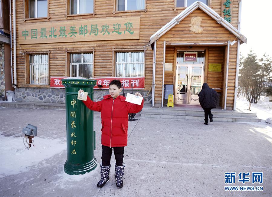1月24日,游客在黑龍江省漠河市北極村郵政局前留影。該郵政局是我國(guó)最北的郵政局。新華社記者王毓國(guó)攝