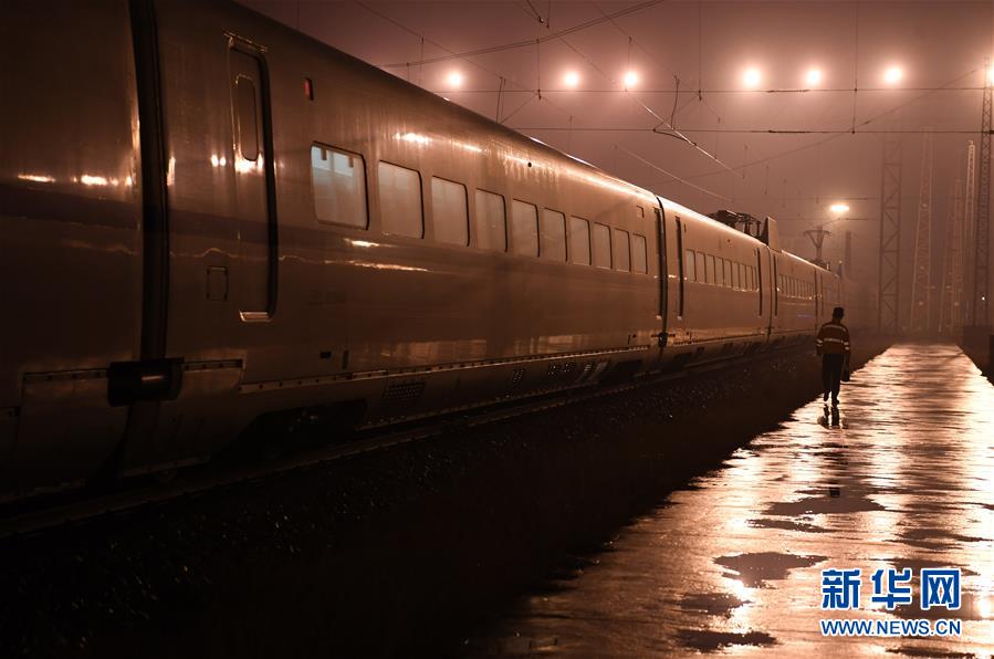 1月29日,王瑞在合肥南動(dòng)車(chē)運(yùn)用所存車(chē)場(chǎng)走向下一輛動(dòng)車(chē)。新華社記者劉軍喜攝