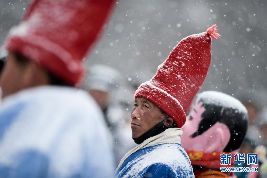 2月16日,社火隊演員在青海省大通回族土族自治縣文化廣場表演。新華社記者吳剛攝
