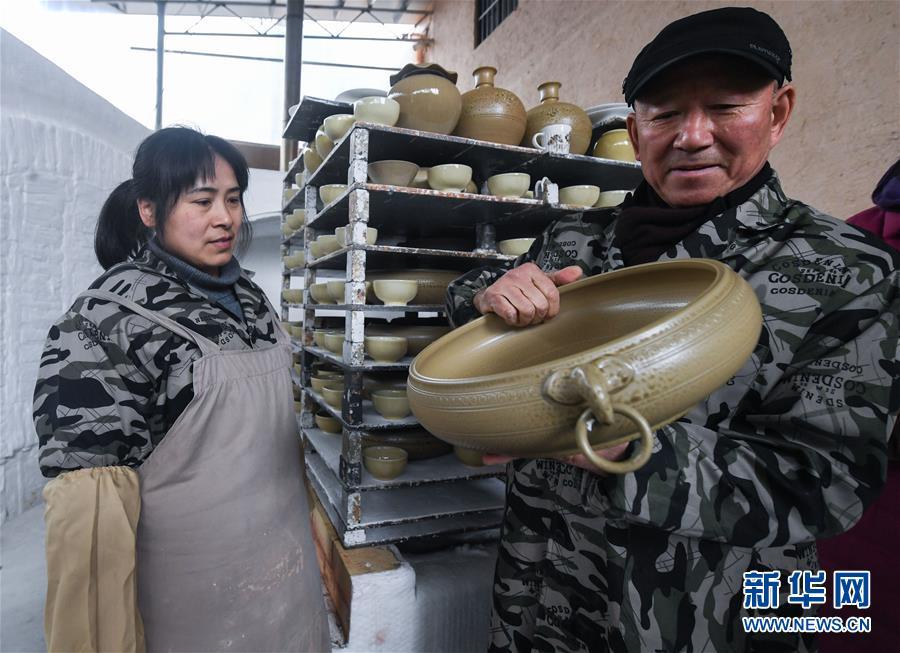 2月16日,陳新華(右)查看農(nóng)歷新年第一窯燒制好的婺州窯作品。新華社記者 徐昱 攝