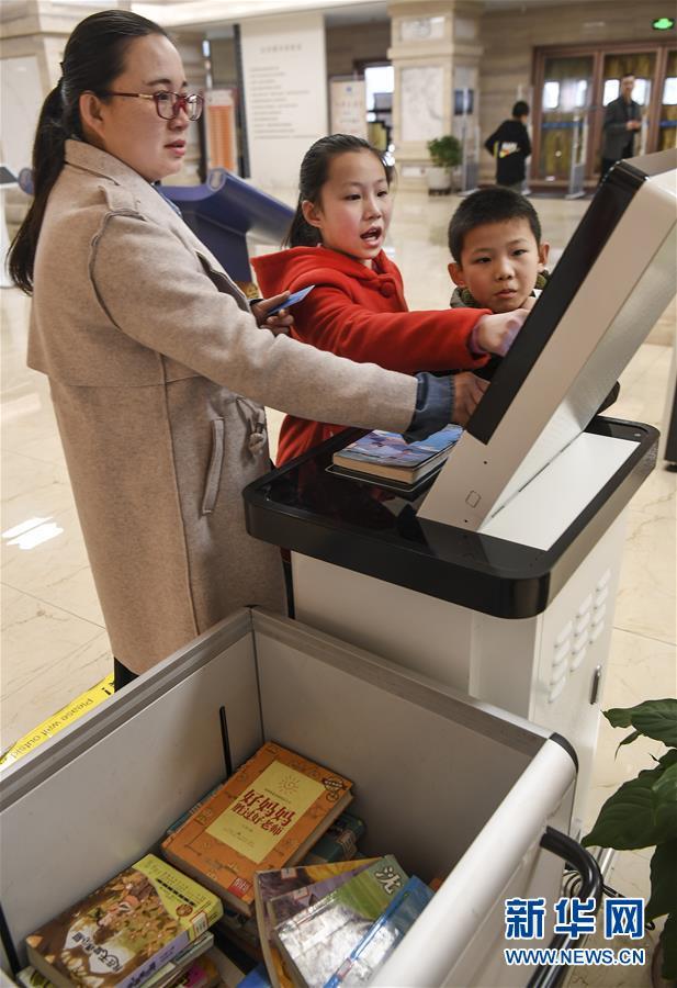 2月24日,一名家長(zhǎng)帶孩子在府谷縣圖書館自助借還機(jī)上借閱圖書。 新華社記者 陶明 攝