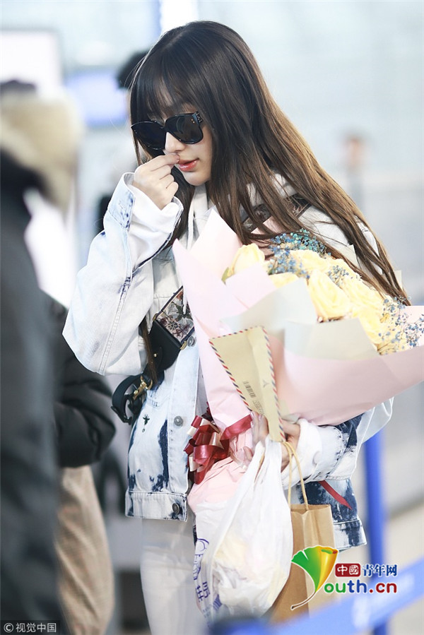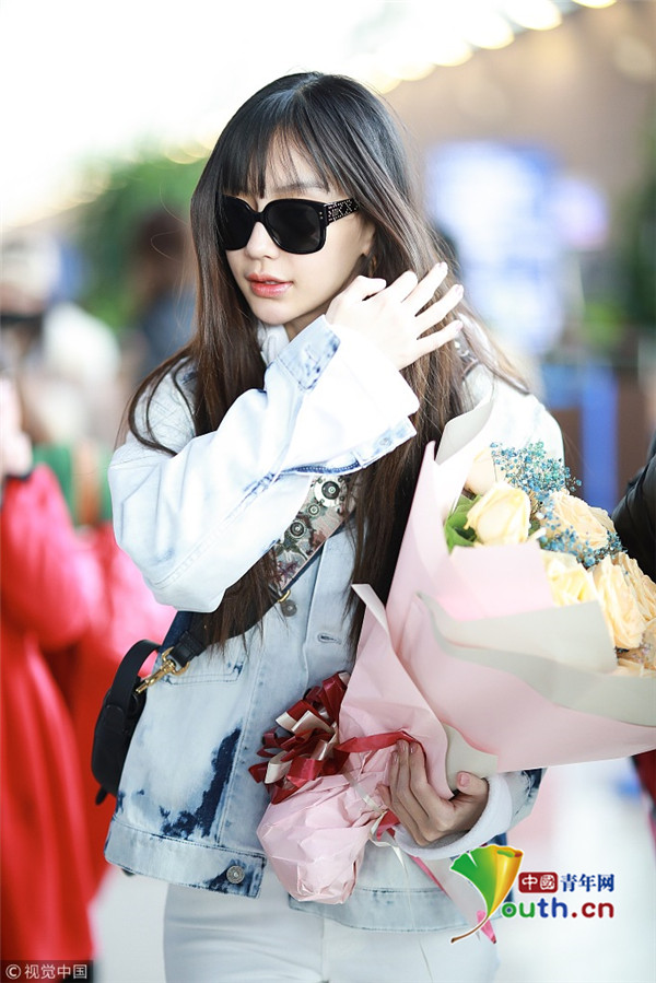 2019年2月24日,上海,楊穎現(xiàn)身機(jī)場。她全白套裝現(xiàn)身身材十分纖細(xì),手捧粉絲送的花與小粉絲合影,十分親切。