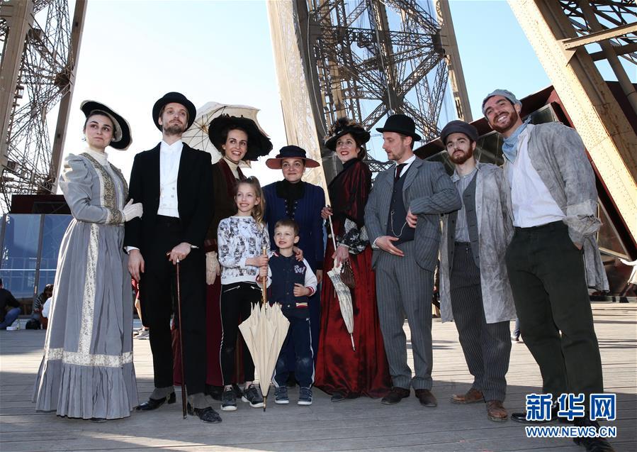 3月30日,在法國巴黎,音樂劇《300米高塔》的演員身著19世紀(jì)服裝在埃菲爾鐵塔一層平臺與游客合影。于1889年3月31日正式落成的法國巴黎埃菲爾鐵塔迎來130歲生日。從30日起,包括演出、冒險游戲、圖片展在內(nèi)的多項活動在埃菲爾鐵塔舉行,為這座宏偉建筑慶生。新華社記者 高靜 攝