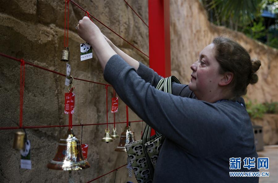 4月6日,在美國圣迭戈動物園,一名游客在“大熊貓友誼墻”上掛上祝福簽。新華社記者李穎攝