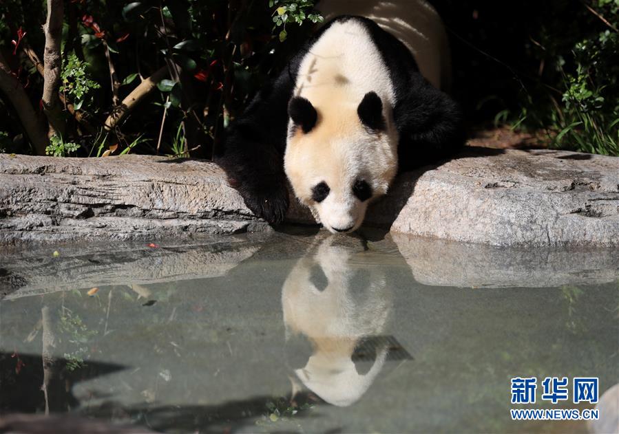 4月6日,在美國圣迭戈動(dòng)物園熊貓館,大熊貓“白云”在喝水。新華社記者李穎攝