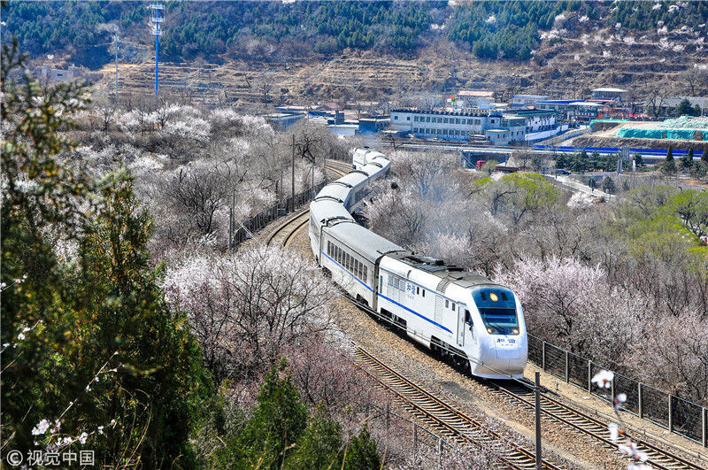 2019年3月22日,北京居庸關(guān)附近的山花盛開,S2線列車穿行在花海之中,構(gòu)成一幅美麗的畫面。時永平/千龍圖像/視覺中國 編輯/陳進