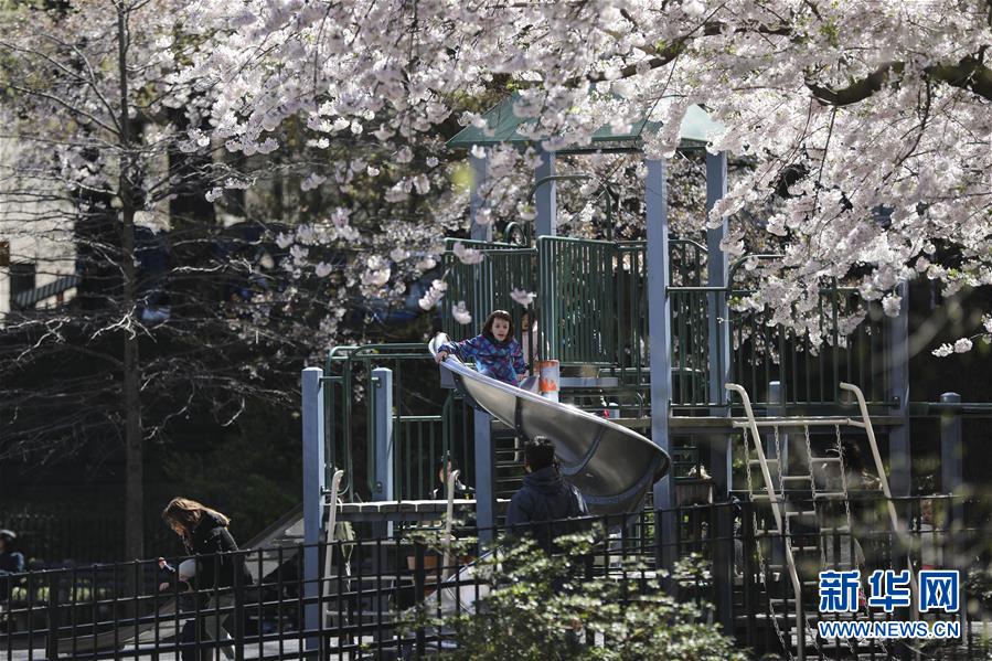 4月16日,孩子們?cè)诿绹?guó)紐約中央公園的一處游樂(lè)場(chǎng)玩耍。 新華社記者 王迎 攝