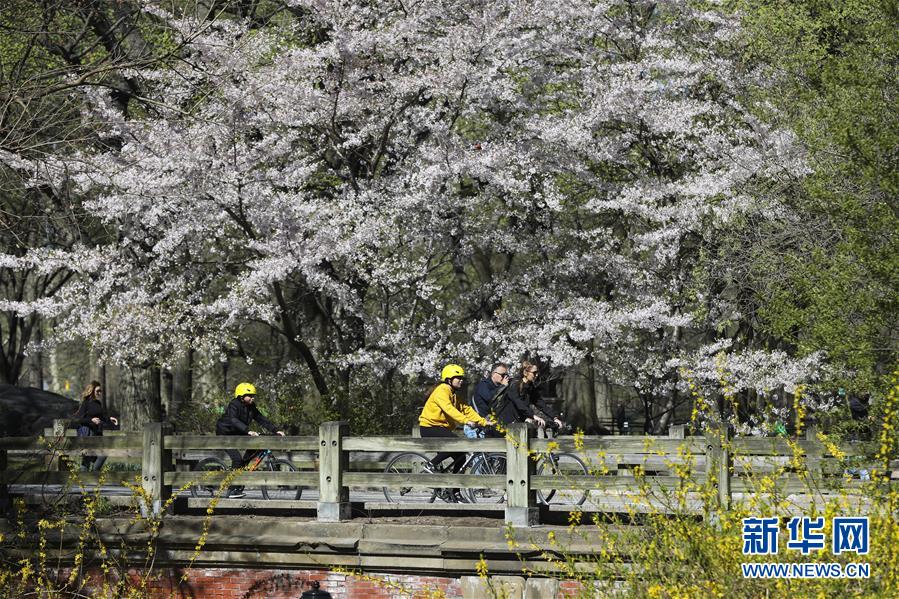4月16日,人們?cè)诿绹?guó)紐約中央公園騎行。 新華社記者 王迎 攝