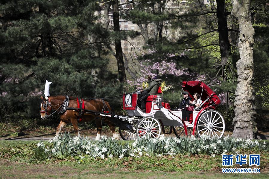 4月16日,人們?cè)诿绹?guó)紐約中央公園乘坐馬車(chē)游玩。 新華社記者 王迎 攝